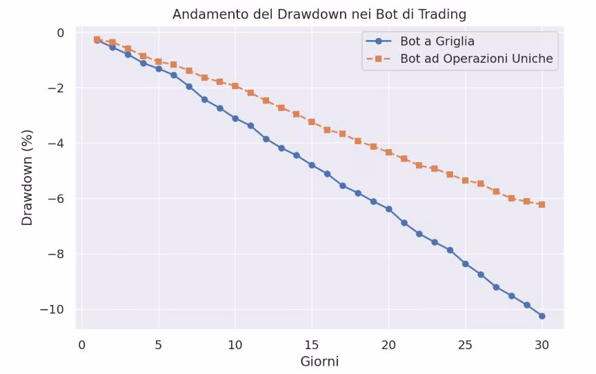 Gli expert advisor a griglia presentano un rischio principale: bruciare il conto se non viene impostato uno stop loss adeguato. Se il livello di stop loss è assente o troppo ampio, il capitale rischia di essere esposto eccessivamente, potenzialmente anche ad una perdita totale. Se il mercato continua a muoversi in una direzione sfavorevole senza inversioni, il bot continuerà ad aprire posizioni con un lottaggio crescente, aggravando il drawdown e rendendo quasi impossibile recuperare le perdite.