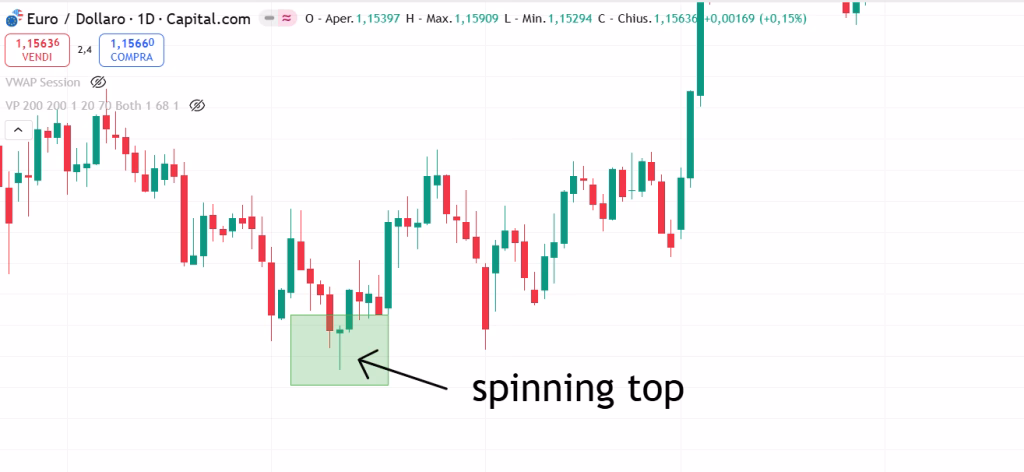La Spinning Top compare spesso dopo una forte accelerazione — sia rialzista che ribassista — e segnala una possibile perdita di forza nel trend in corso.